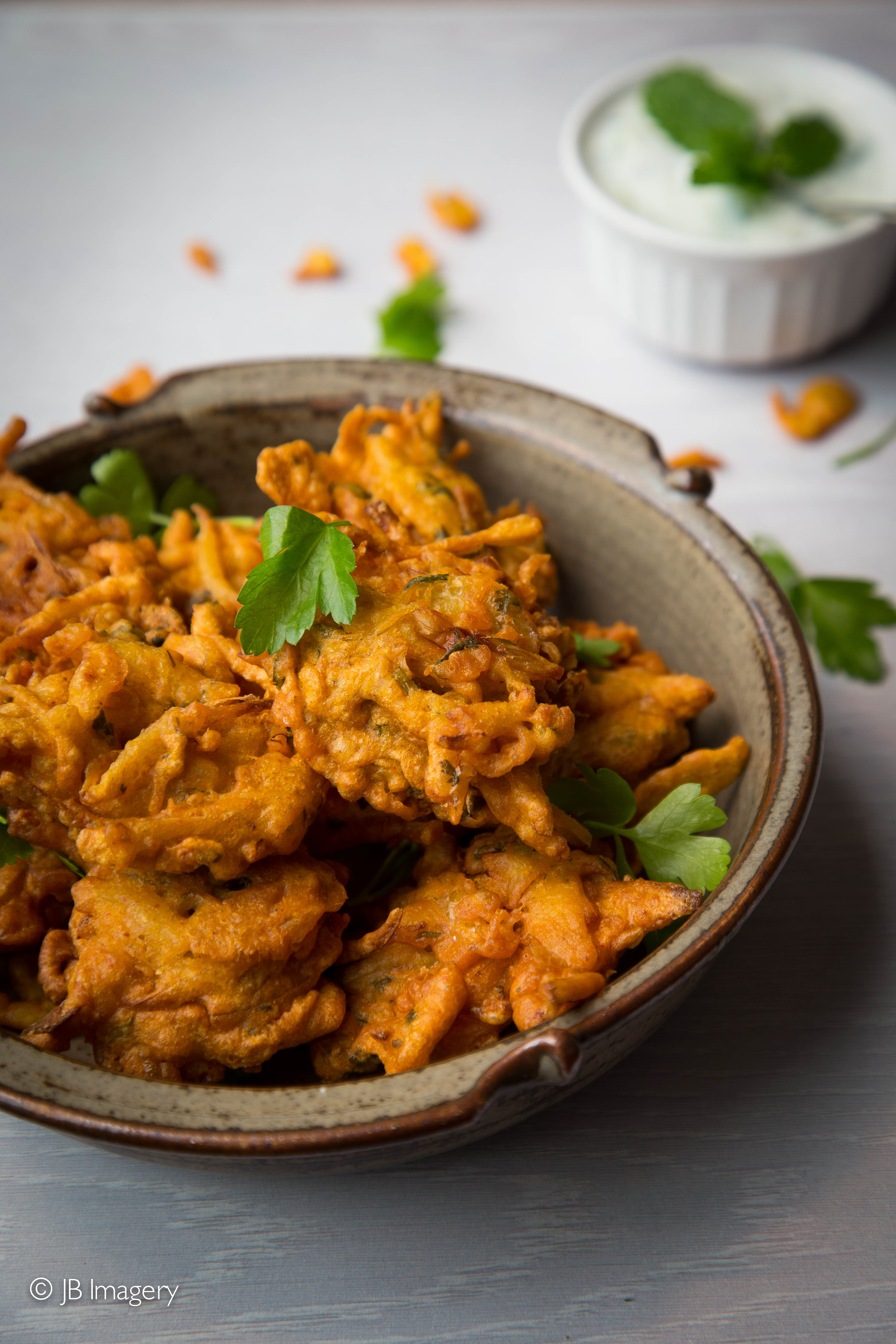 Just mix chickpea flour with water to make a pancake batter consistency, and add salt, turmeric, chilli powder, garlic and ginger paste, green chillies and coriander. And a pinch of baking powder. Chop up the onions into thin strips (about 2-3cm long) and coat it in the batter. And then you are ready to fry! I served it with a cucumber and fresh mint yogurt dip, which cools down the spicy bhaji.