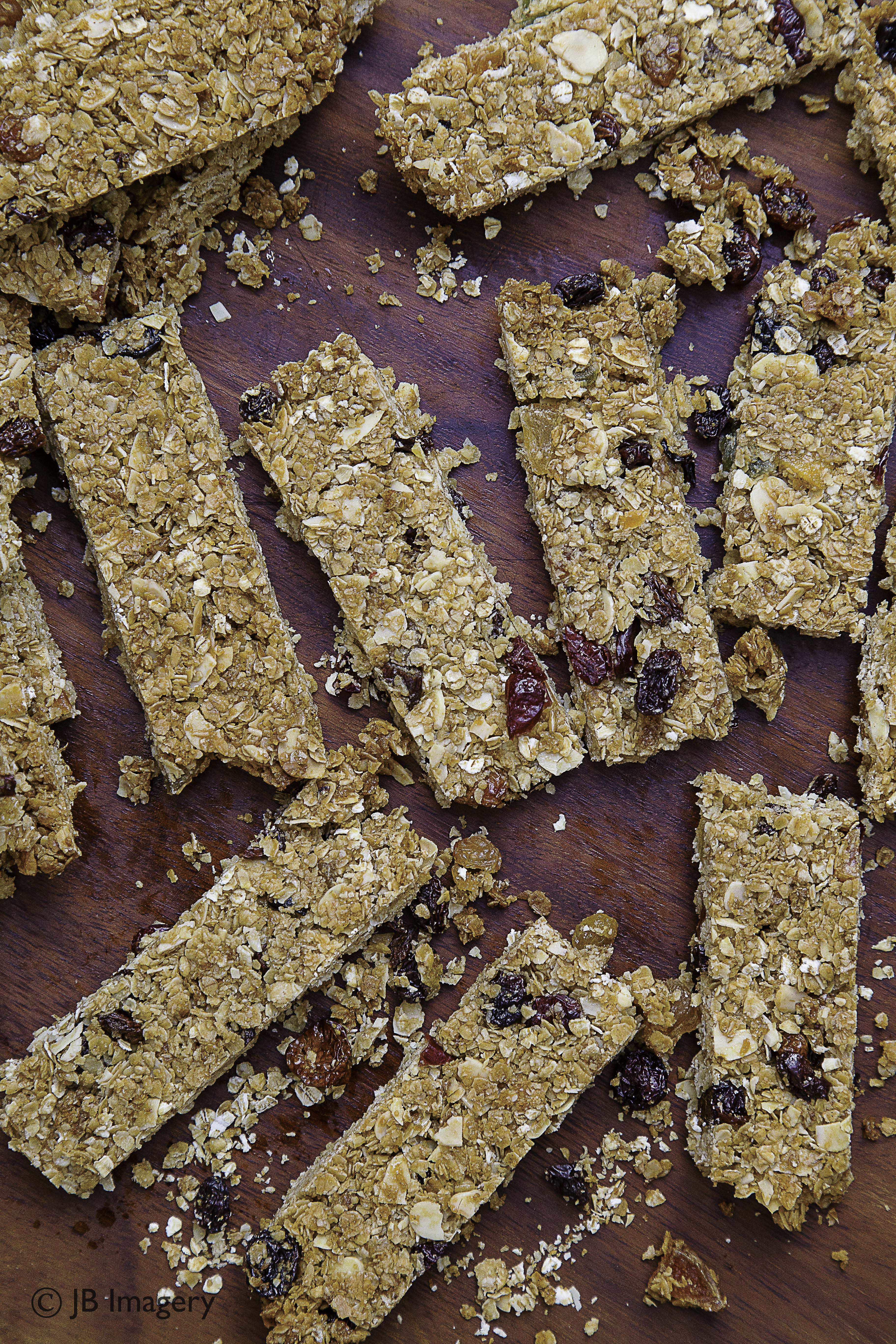 These are made with oats, coconut, almonds, crushed weetabix, and dried fruit. I added some honey, brown sugar and little bit of butter to bind it all together. Now I know what you are thinking. Butter and sugar? Fattening! But if you think about how much goes into a whole batch that will make about 20 bars it’s not that much. Besides I think a bit of butter does you good…sometimes.