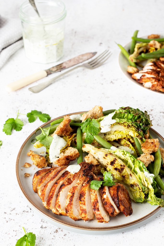This is my twist on a chicken salad. Spicy tandoori chicken served with warm braised lettuce (yes that’s right!), green beans, garlic croutons and a mint yoghurt dressing.