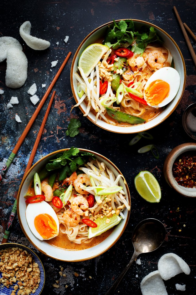 This recipe is for two people but can easily be adjusted for more or less. It’s also a recipe that can be played with. You can add different vegetables or keep it vegan by taking out the prawns, egg and fish sauce and replacing it with tofu and soy sauce. You can add more spice if you want it really hot or keep it mild and creamy.