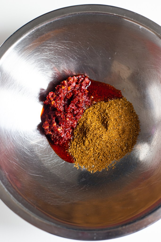 I marinated 6 chicken drumsticks in 2 heaped tsps of this spice blend and 2 heaped tsps of harissa paste. Harissa is another popular ingredient in Morocco. A chilli paste made with different herbs and spices. I used a Rose Harissa paste from Belazu, the best one in my opinion!