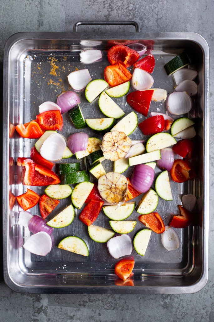 Next I prepared the veg for my warm salad. I simply chopped up peppers, courgettes, red onion and one garlic bulb and placed it into a roasted tray with a little olive oil and a little pinch of ras el hanout. I placed the chicken on top and roasted it in an oven at 200 degrees C for about 45-50 minutes.