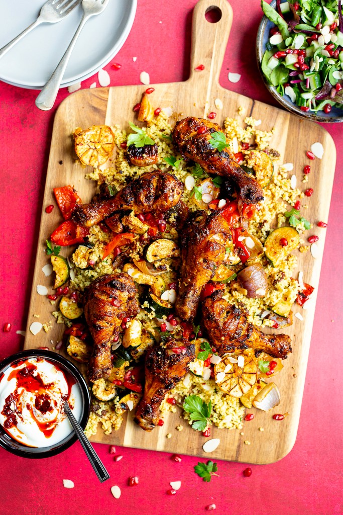 Although Autumn normally means comfort food, I do like to keep it light during the week. Also I think comfort food can be anything, from soups and stews to roast chicken and a warm salad. My husband randomly requested chicken drumsticks in some form, so I thought why not roast them up with some warm spices and serve it with a hot couscous salad.