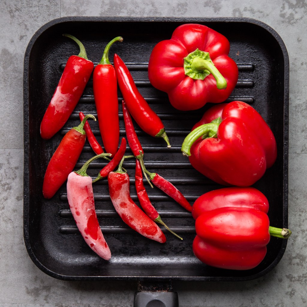 I cooked the peppers and chillies on a grill pan until blackened and charred. You might want to open the windows for this!
