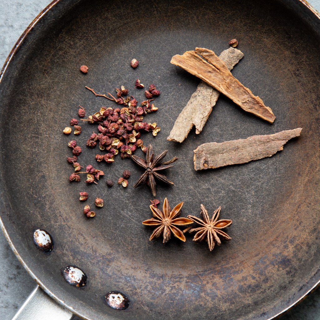 In the mean time, I toasted the whole spices in a frying pan to bring out the flavour. I left the star anise and cinnamon whole, but I crushed the peppercorns once toasted.