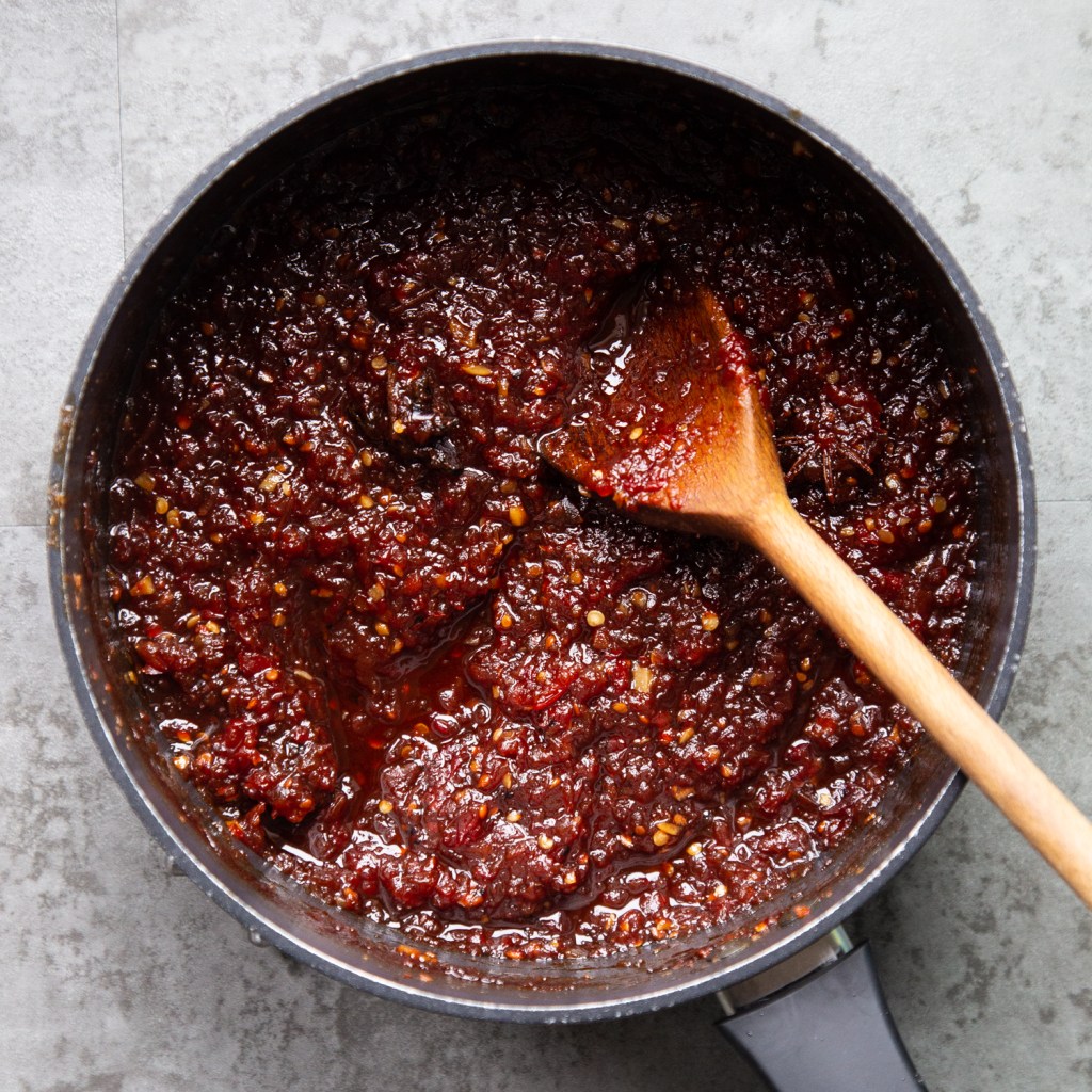 I placed the mixture in a pan, added the remaining ingredients, whole spices and simmered on a low heat for about an hour, stirring frequently. After an hour I was left with a sweet sticky chilli jam that coated the back of the spoon without running off too quickly. This meant that it was just the right consistency.