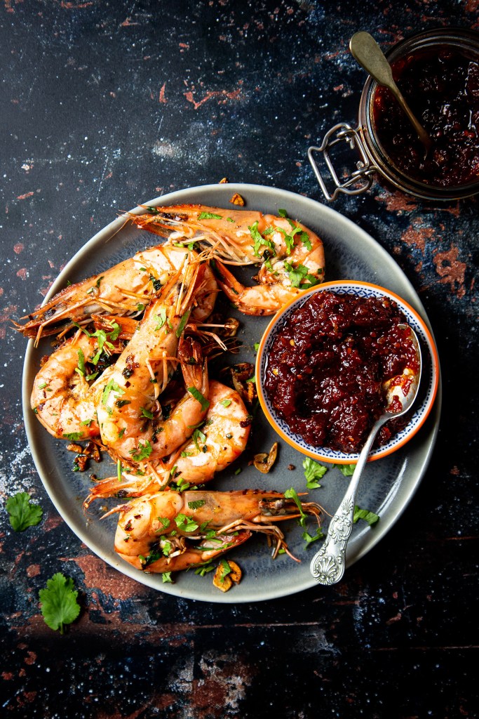 I simply cooked up some whole, shell on king prawns in garlic, chilli flakes, lemon and coriander and used them to dip into my chilli jam. The taste of the sweet prawns with the spicy jam was divine. This is great to serve at a party or for friends/family when they come to visit. You could even make a whole batch of jam and give it out as gifts! Who would like some? :p