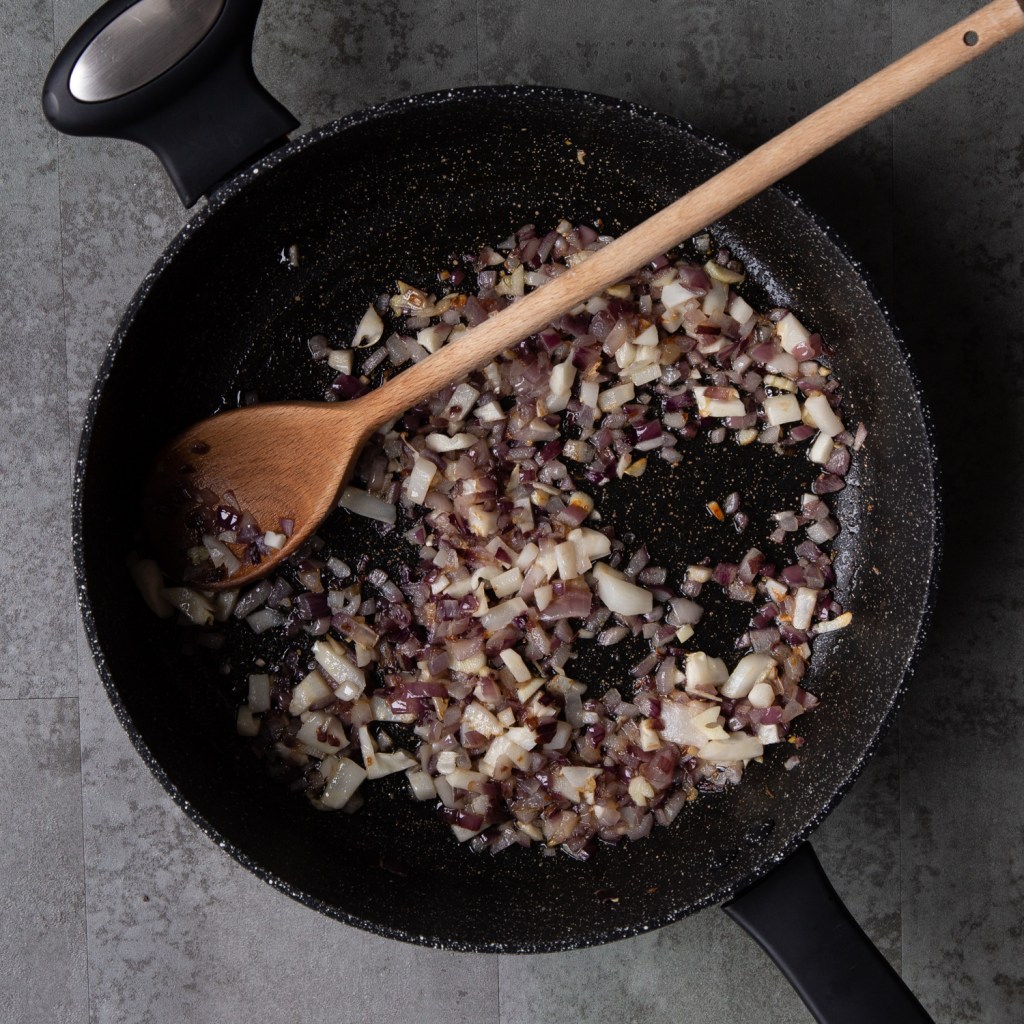 2. Meanwhile, in a large pan melt a knob of butter on a medium heat and add the onions and garlic to soften down for a few minutes. I also added any remains from the cauliflower stem to avoid any waste by simply chopping it up.