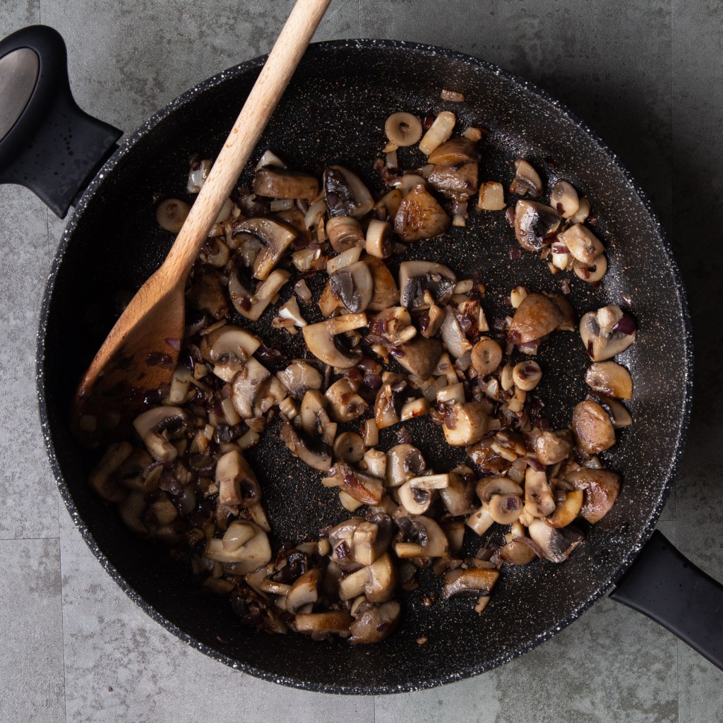 3. Next, add the mushrooms and fry until golden brown. Then add a tablespoon of flour and cook out for a minute or so.