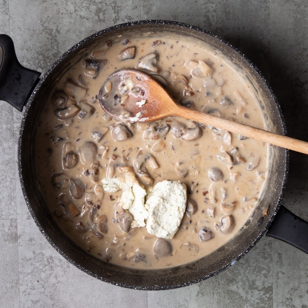 4. Once the flour is cooked, add a splash of milk and mix through slowly. Then add more and more of the milk to create a sauce. Add the stock cube and a splash of boiling water. Simmer the sauce for a few minutes until thickened and then add a tbsp of Boursin cheese.