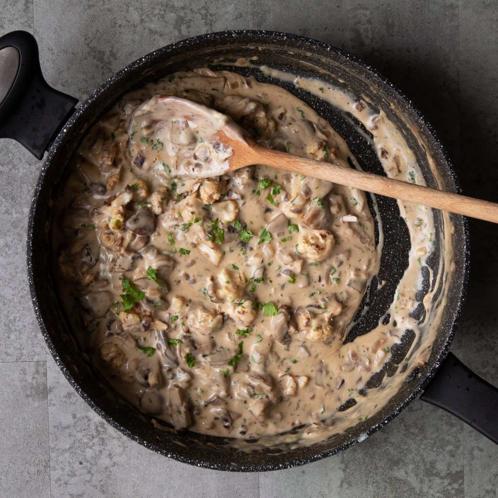 5. Once the sauce has thickened nicely, add the roasted cauliflower and chopped parsley. The filling is now complete. Leave to cool slightly.