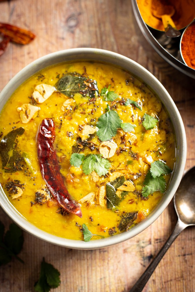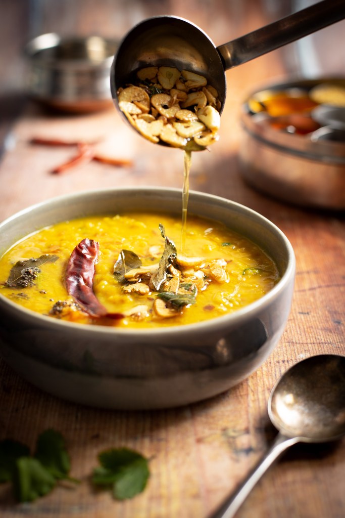 - Pour the tadka over the dal and serve with a garnish of coriander leaves. This can be eaten with rice, roti or just on its own as a soup. Enjoy!