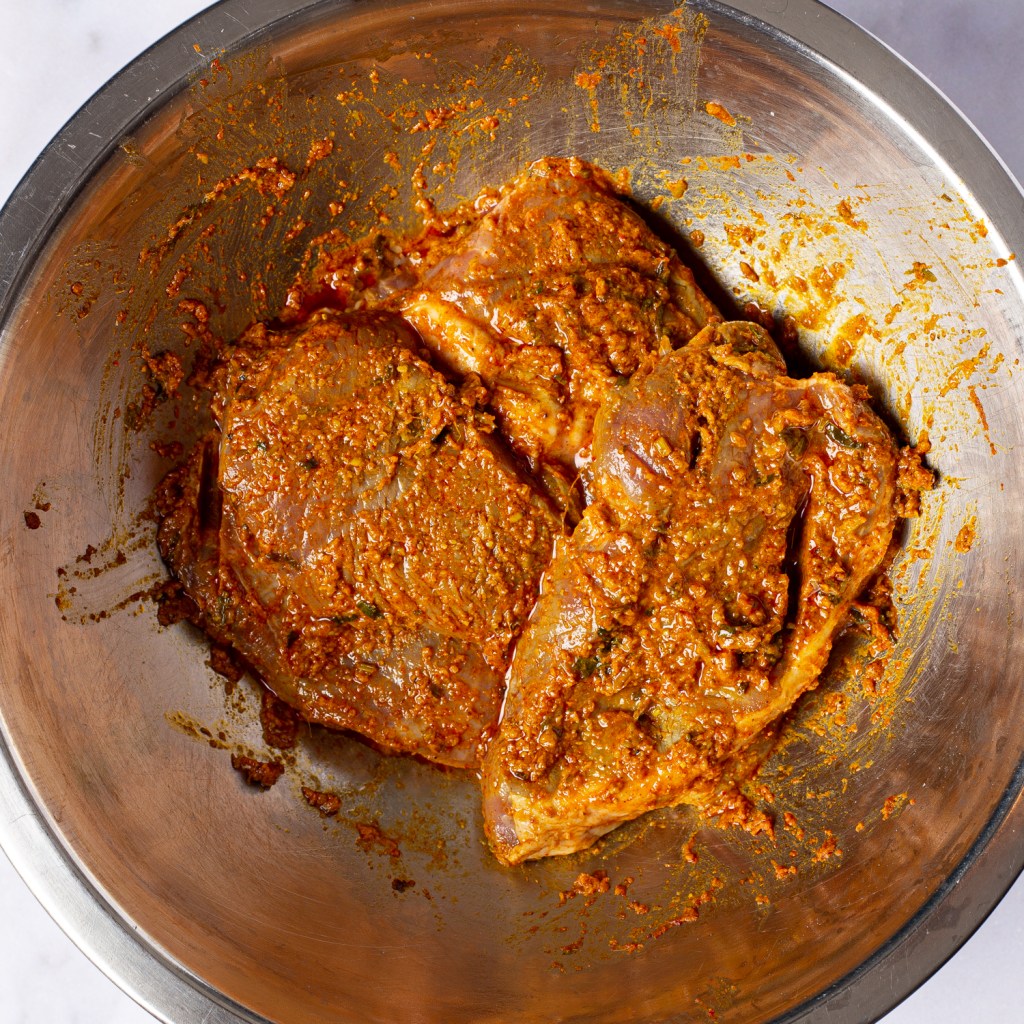 On this occasion, I made masala lamb steaks and they were absolutely delicious. Spicy, charred and tender. Here’s how I made mine. I marinaded two steaks (300g) in a basic masala: