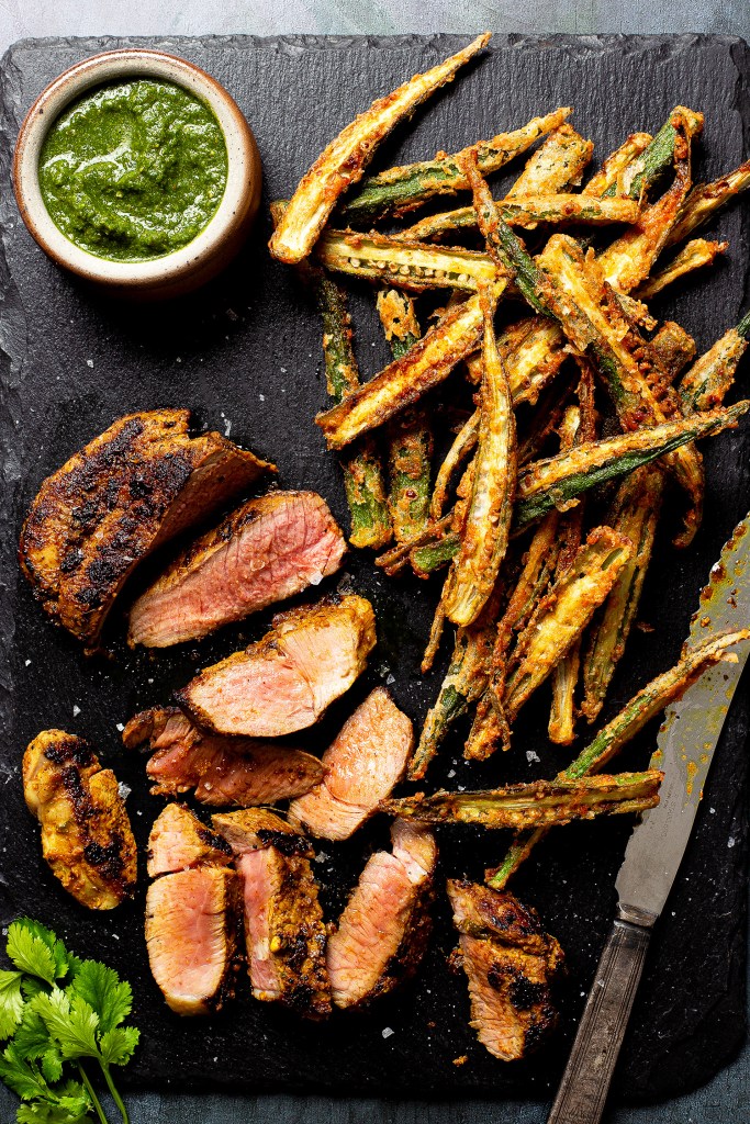 I let it rest for a few minutes then sliced it up, served alongside my okra fries and Dishoom’s mint and coriander chutney. Heavenly!