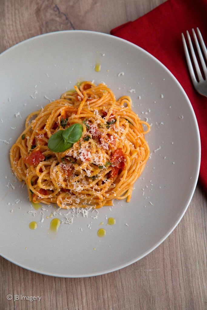 Spaghetti Pomodoro has been one of my favourite dishes ever since I was in University (which was many moons ago). In a very student like manner, I remember I would make a very basic spaghetti every week with a large jar of Dolmio sauce and covered it in a mountain of cheddar cheese. It was sloppy, tangy and I loved it at the time. Especially because I could eat a ginormous plate of it and not put on any weight. The good old days.