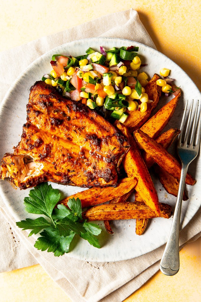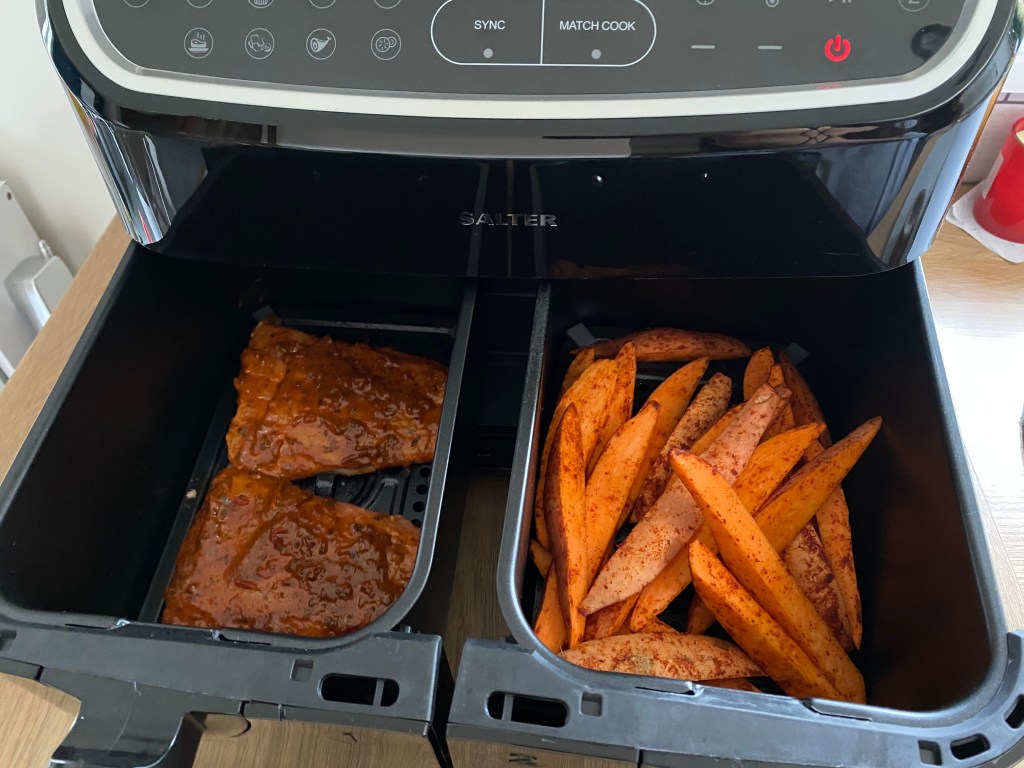 This is one of my go to meals and my family love it. I have well and truly jumped on the air fryer bandwagon. I can’t help it. Everything cooks so quickly in it and comes out perfectly. I have a dual Salter Air Fryer that is so useful because of the two compartments. I cooked my salmon on one side and my sweet potato fries on the other and my dinner was ready in 15 minutes. Naturally this can be made in a conventional oven too.